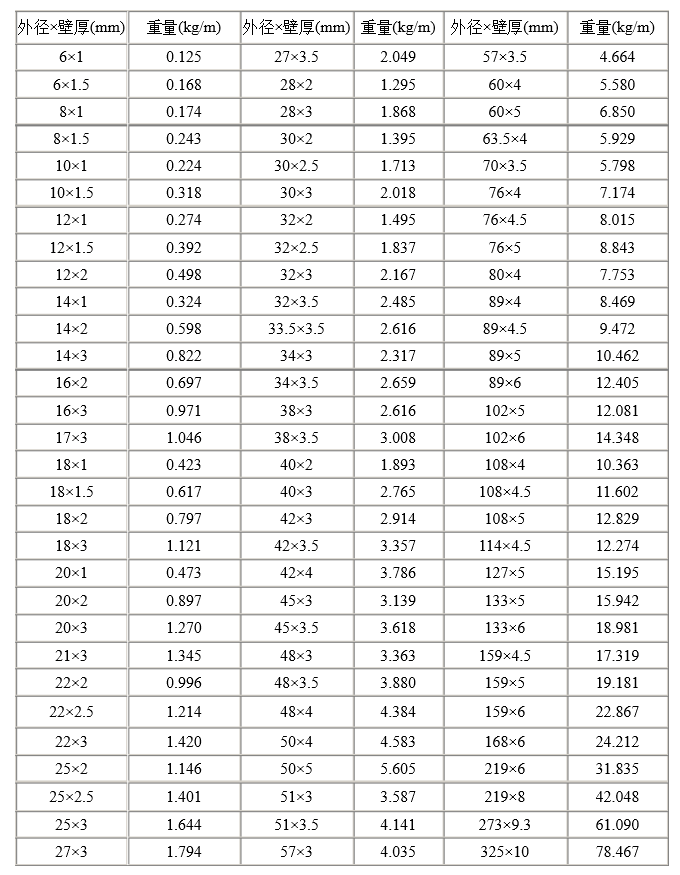 表供大家參考。正佳不銹鋼是一家集生產(chǎn)、銷售、加工、服務(wù)為一體的大型企業(yè),每一支不銹鋼管都是嚴(yán)格按照制作流程進(jìn)行加工制造,每一支管子的重量都會(huì)控制在國(guó)標(biāo)的范圍之內(nèi)。我們的管子是可以根據(jù)客戶的要求過磅銷售的,所以在管子的重量上您可以放心,歡迎咨詢!
